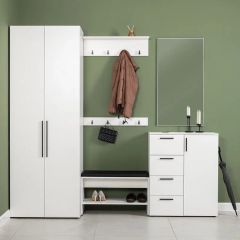Вместительный шкаф полноразмерной глубины можно дополнить тумбой для обуви с мягким сиденьем и нишами для хранения, зеркалом и минималистичными вешалками.
