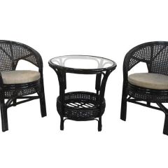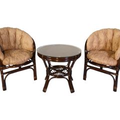 Комплект мебели Пеланги 02/15 включает в себя: 2 кресла и столик с красивым плетением снизу и полочкой, съемные подушки из материала улучшенного качества.